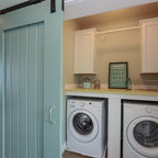 One of the laundry room ideas is to hide the area behind a sliding barn door. In this scheme the door is a bright aquamarine blue that echoes the color of the bottom of the French window curtains. Need a quick home makeover?